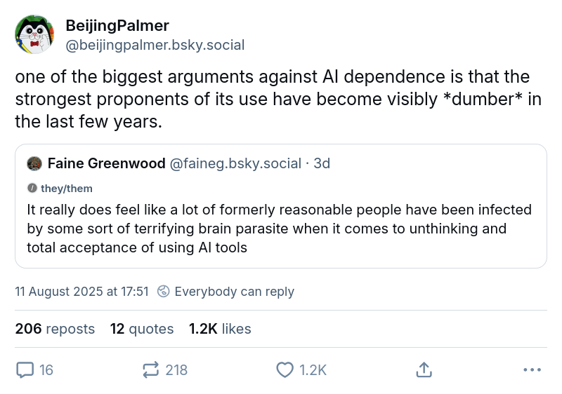 Faine Greenwood @faineg.bsky.social It really does feel like a lot of formerly reasonable people have been infected by some sort of terrifying brain parasite when it comes to unthinking and total acceptance of using AI tools BeijingPalmer @beijingpalmer.bsky.social one of the biggest arguments against AI dependence is that the strongest proponents of its use have become visibly *dumber* in the last few years.