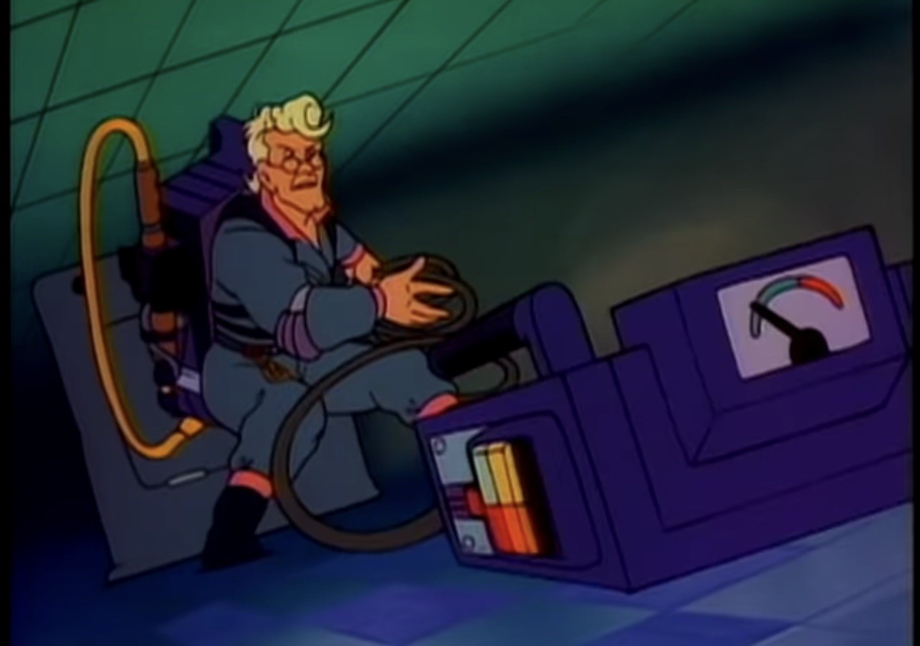 Egon Spengler from The Real Ghostbusters, with blonde hair styled in a wave, wearing a blue jumpsuit and a proton pack, is seen operating a ghost trap. Egon has a focused expression and is handling the cables in a room with a tiled floor and walls.