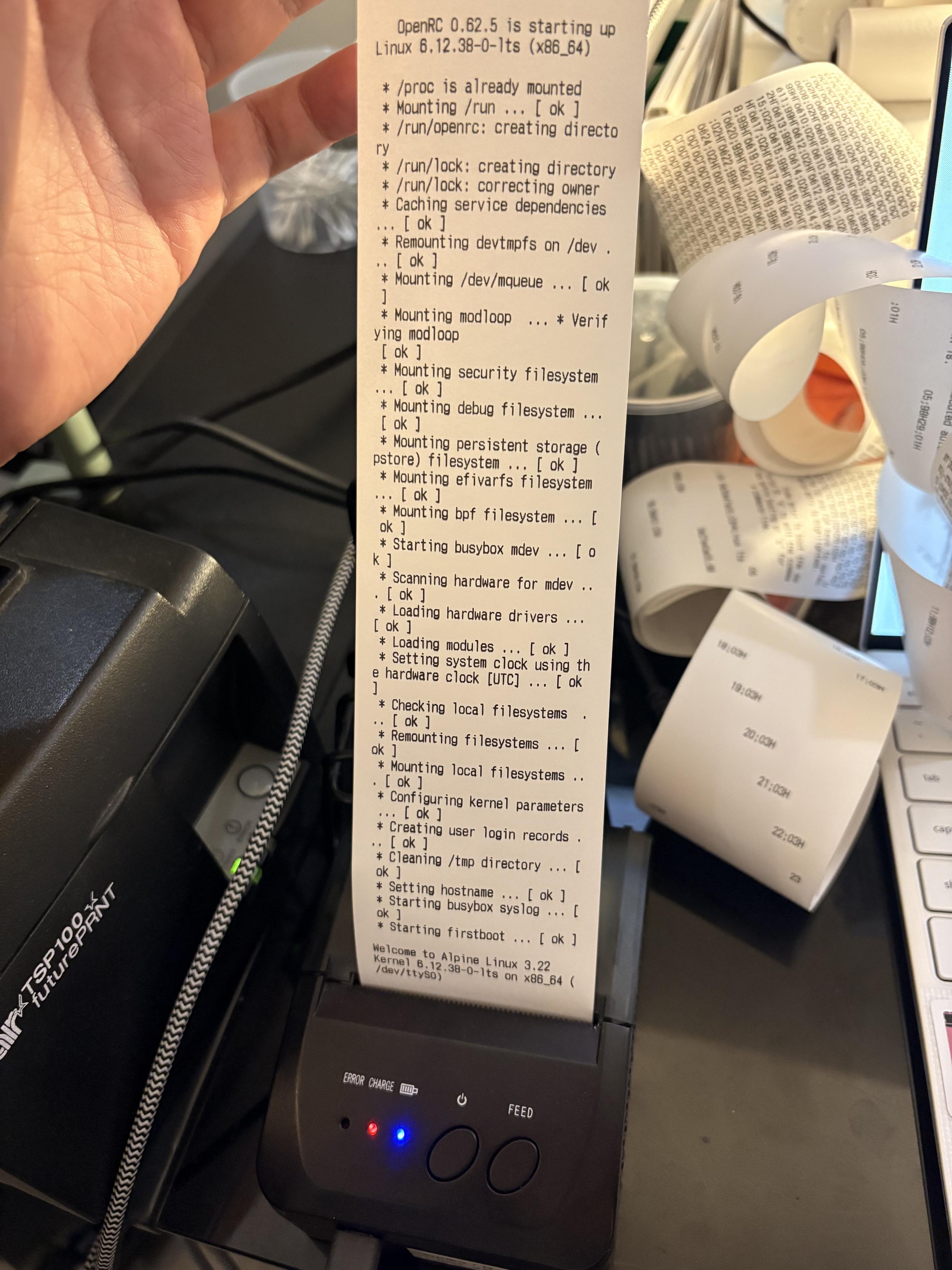 a receipt printer with a pretty long alpine linux boot log thereβs a few rolls of grub output behind the receipt printer