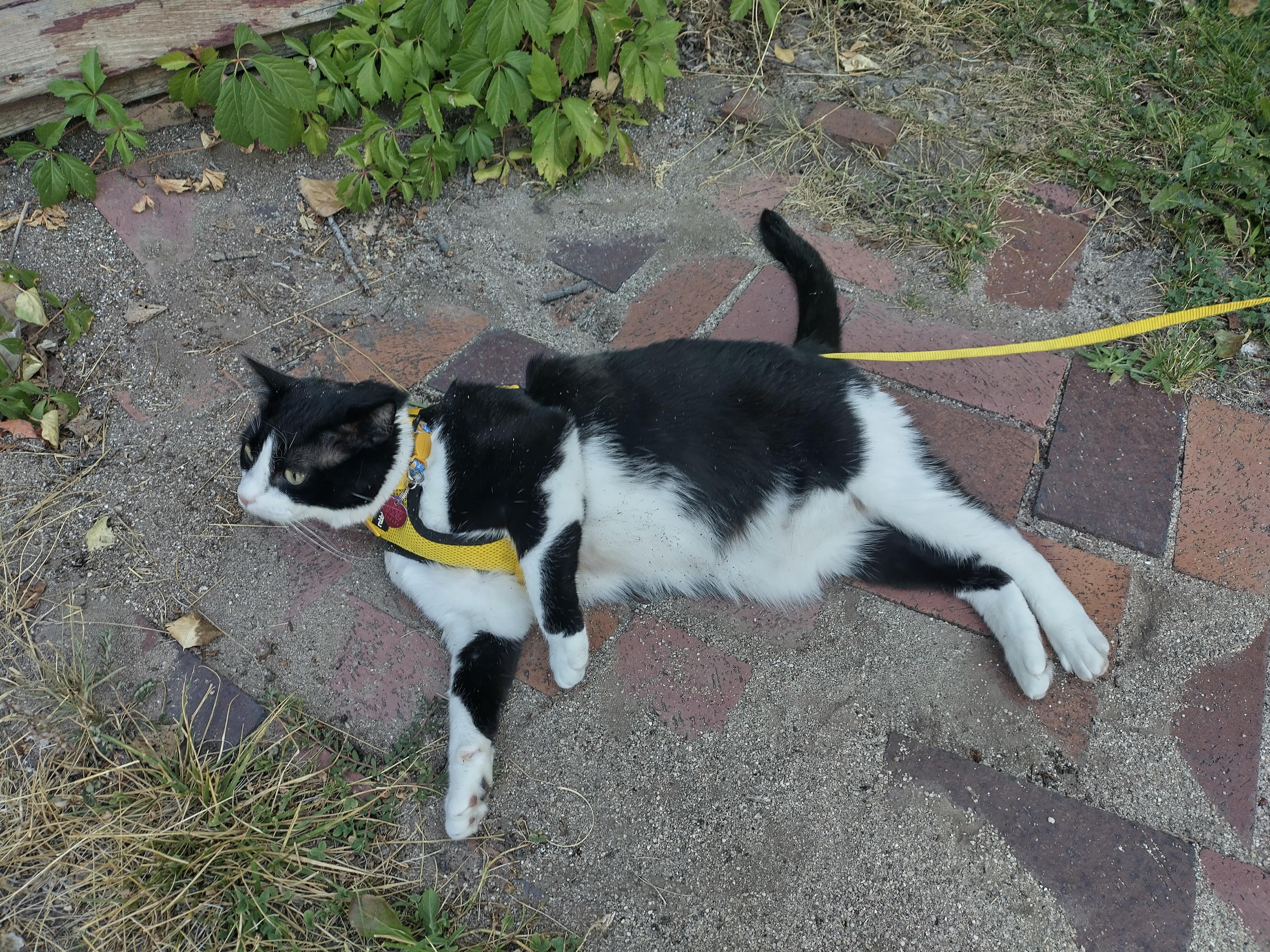 A tuxedo cat wearing a harness outdoors. She is flopped on her side