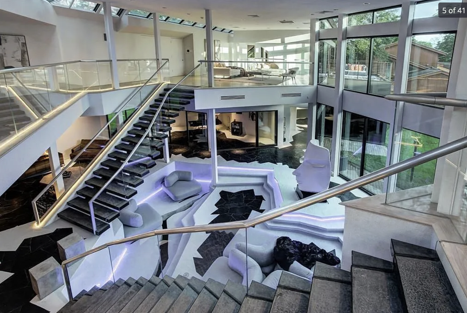 The interior of the house as seen from an upper landing. There are lots of steps in different directions, and the living room is across several small levels. It is a very modern interior with lots of white and glass.