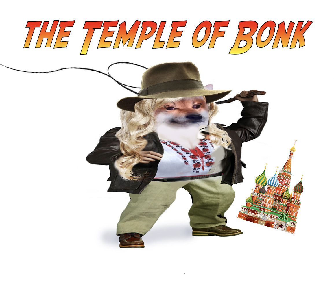 The heading reads "The Temple of Bonk" in Indiana Jones-like lettering. The image is of a female #NAFO dog styled to look like Indiana Jones, she has long, wavy blond hair, she's wearing a fedora, a white & red embroidered #Ukrainian Vyshyvanka shirt, khaki pants, brown shoes, & she's cracking a whip (at vatniks, of course, lol!) & the image shown at an angle to the right below her arm is Saint Basil's Cathedral in Moscow.
