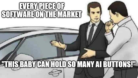 car salesman image macro/meme. caption: "every piece of software on the market" / ""This baby can hold so many AI buttons!""
