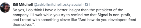 King of mnasplaining Bill Mitchell digging far beyond an abyssal level : "So yes, I do think I have a better insight than the president of the company. I'll wait while you try to remind me that Signal is non-profit, and I retort with something clever like "And how do you developers feed themselves"."