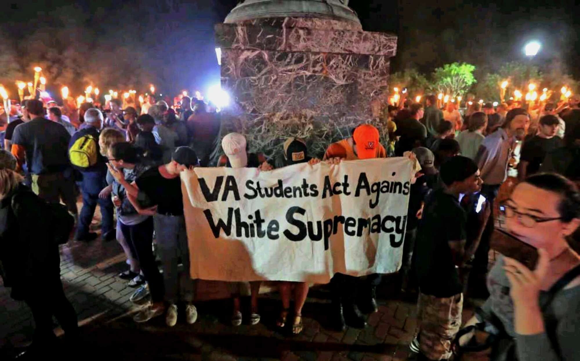 A few students holding a banner reading "Virginia students act against white supremacy," surrounded by torch-bearing fascists and Klansmen.