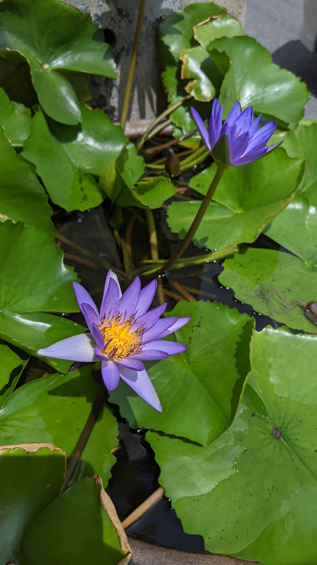 Two purple lotus flowers and their bright green leaves, in a water barrel on the sidewalk.