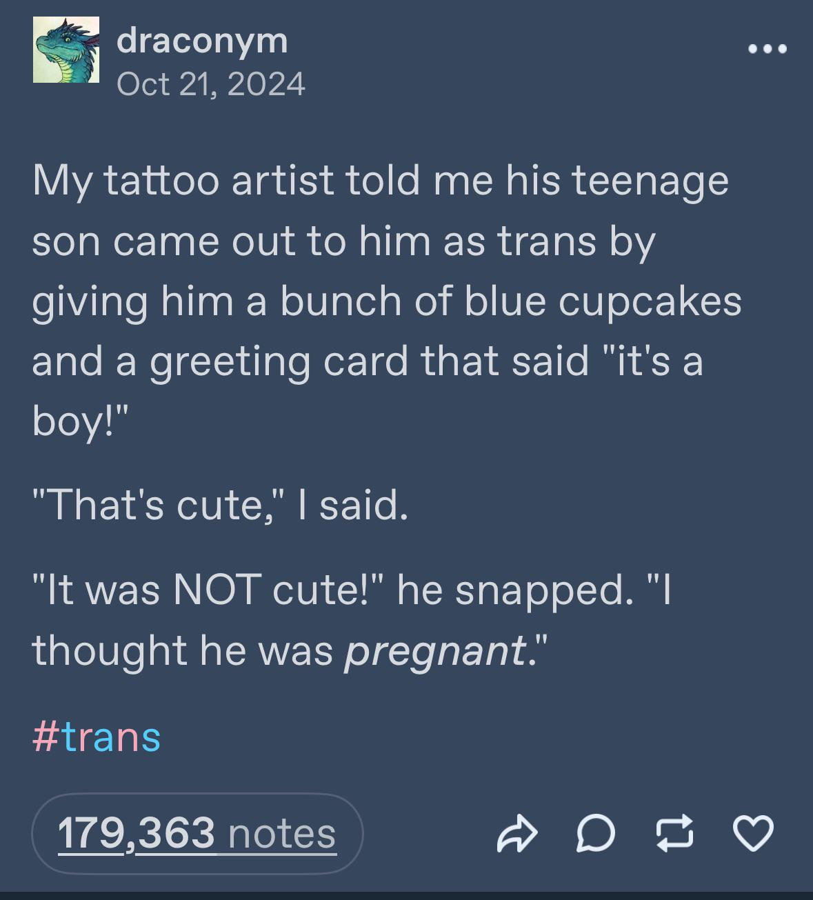 a screenshot of a post from who knows where saying: my tattoo artist told me his teenage son came out to him as trans by giving him a bunch of blue cupcakes and a greeting card that said "it's a boy!" "That's cute" I said. "It was NOT cute!" he snapped. "I thought he was pregnant."