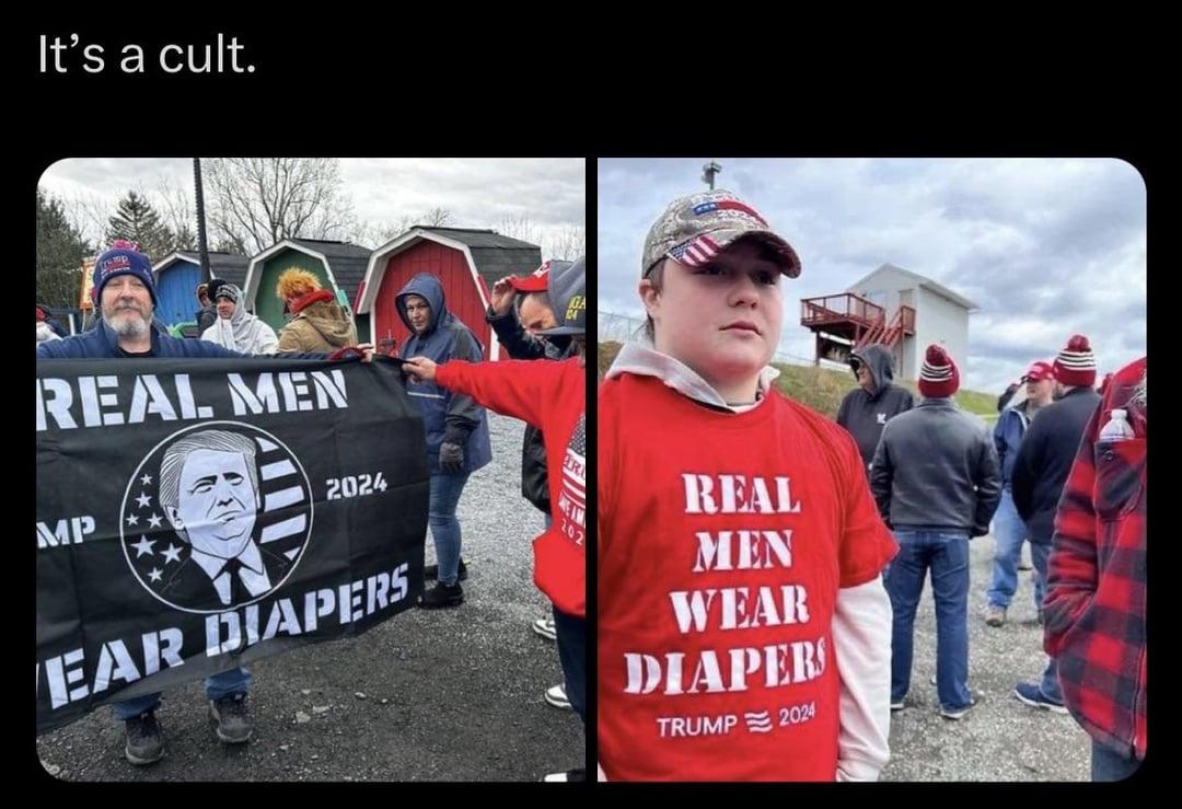 Real men wear diapers sign and man wearing shirt that says, "real men wear diapers"