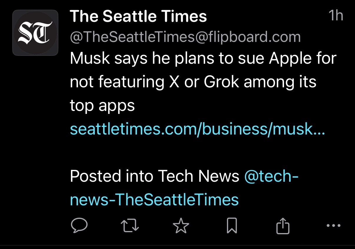 The Seattle Times 1h @TheSeattleTimes@flipboard.com Musk says he plans to sue Apple for not featuring X or Grok among its top apps seattletimes.com/business/musk... Posted into Tech News @tech- news-TheSeattleTimes