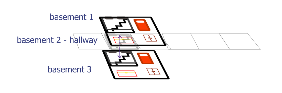 A three-floor clumsily made isometric diagram of two identical rooms connected by staircases to a hallway between them.