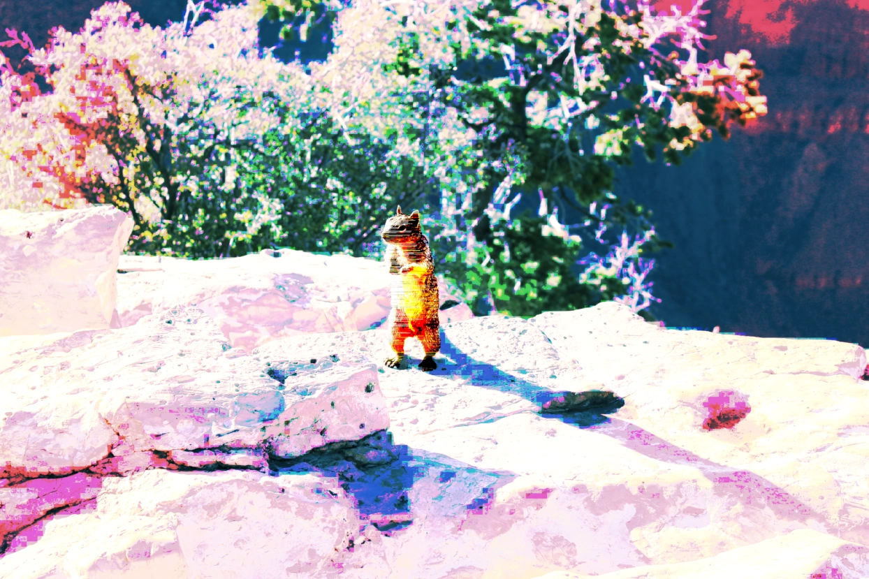 A photo taken at the Grand Canyon, featuring a small creature (squirrel?) standing in front of a bush. The colors are unnatural, over saturated, and largely blown out. There is pixelization and artifacting throughout.