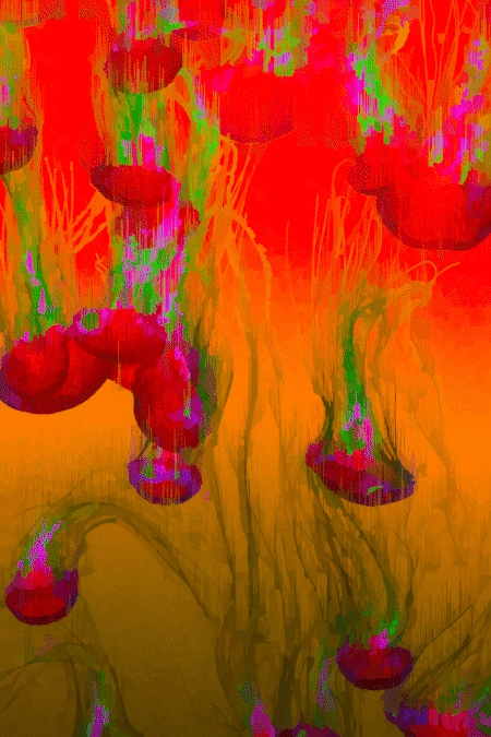 Jellyfish color shifted to be largely red and orange with bright shocks of neon green and small bursts of lavender. The photo is distorted to look almost watercolor like with artifacting blasting upward.