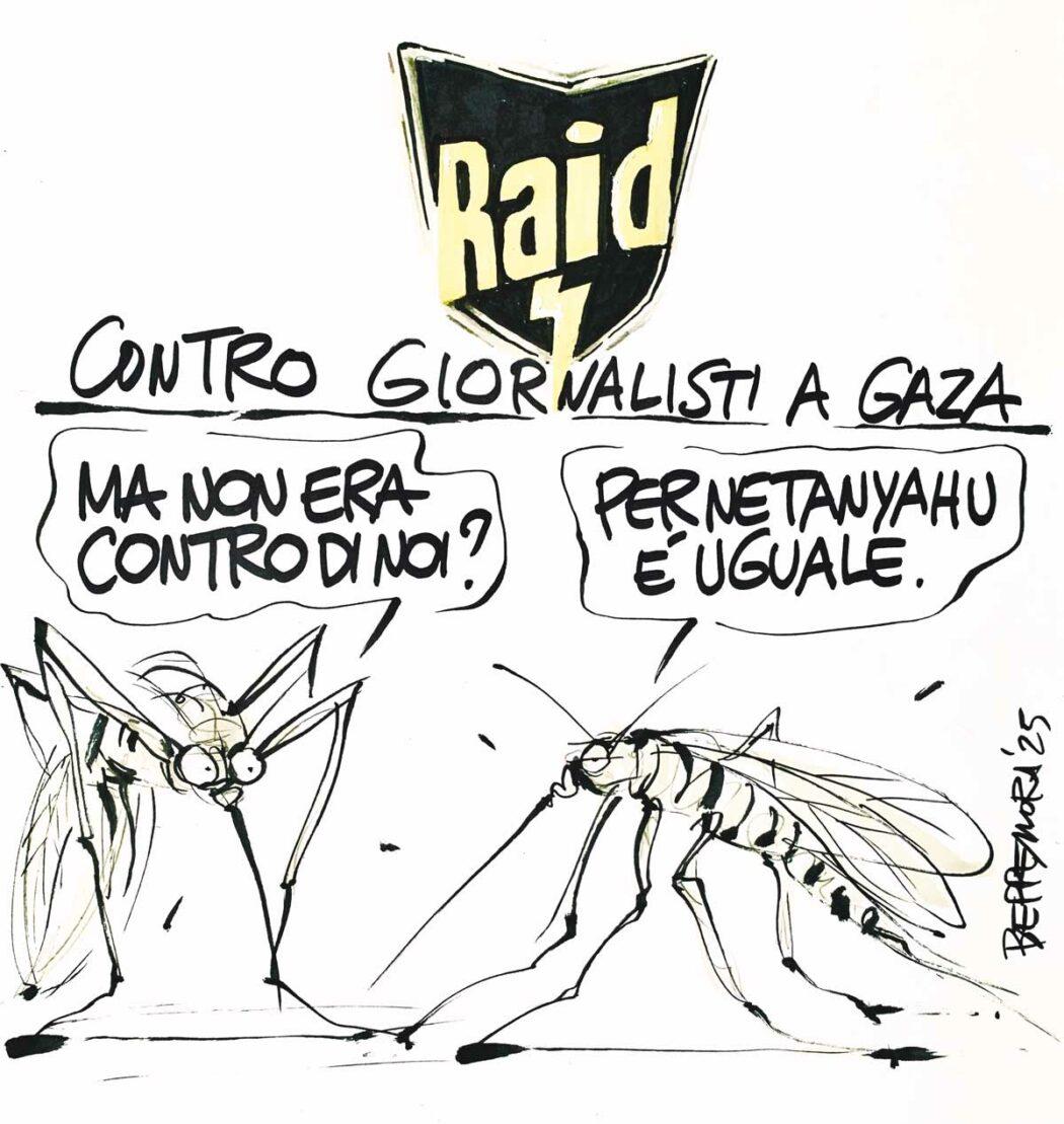 'Raid contro giornalisti a Gaza'. Nel disegno, due zanzare parlano tra loro. "Ma non era contro di noi?", chiede la prima guardando il logo dell'insetticida Raid in alto nelle vignetta. "Per Netanyahu รจ uguale", le risponde l'altra zanzara.