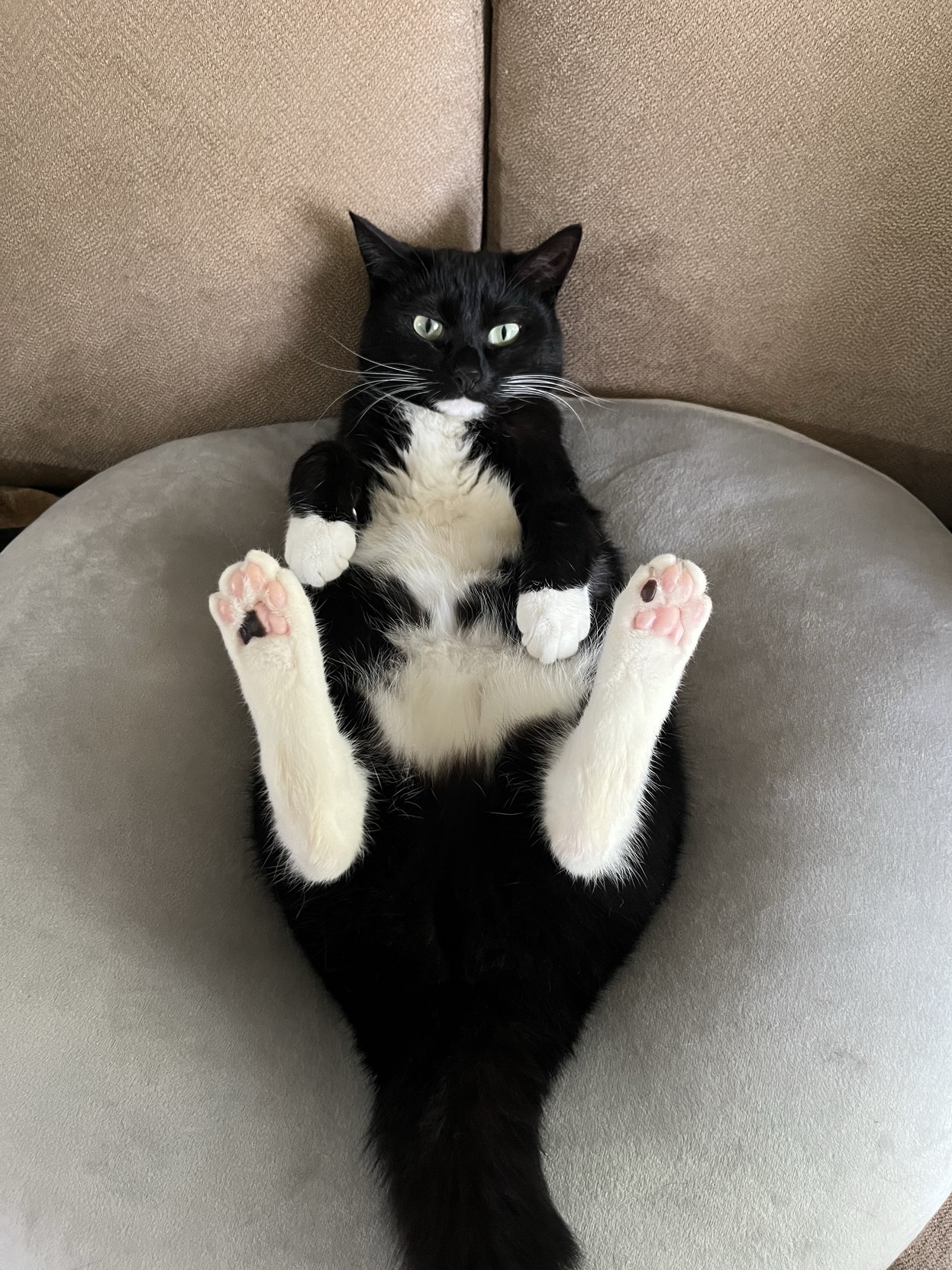 A black and white cat is lounging on its back with its paws in the air, displaying pink paw pads. The cat is on a round, light-colored cushion, with a textured sofa in the background.