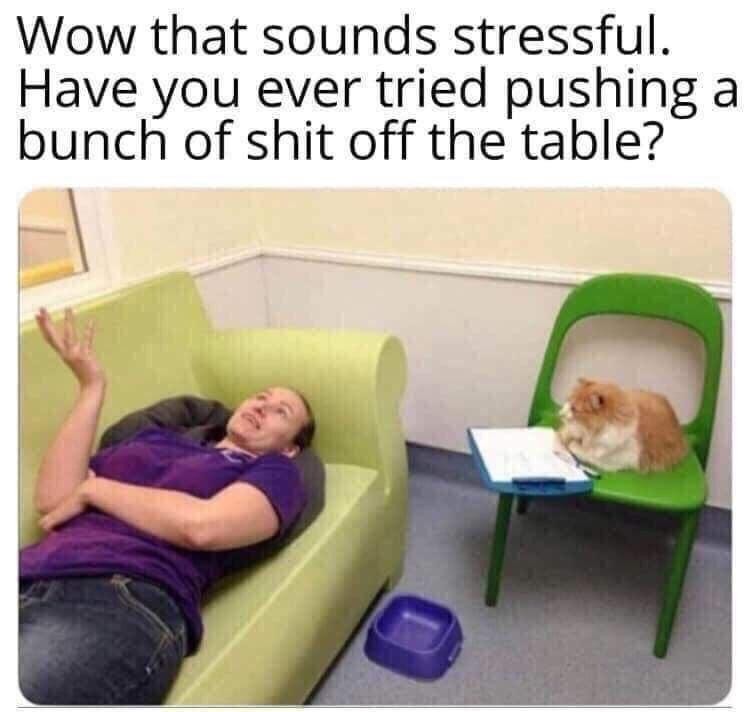 A person lies on a couch talking to a cat sitting on a chair with a notepad. Transcribed Text: Wow that sounds stressful. Have you ever tried pushing a bunch of shit off the table?