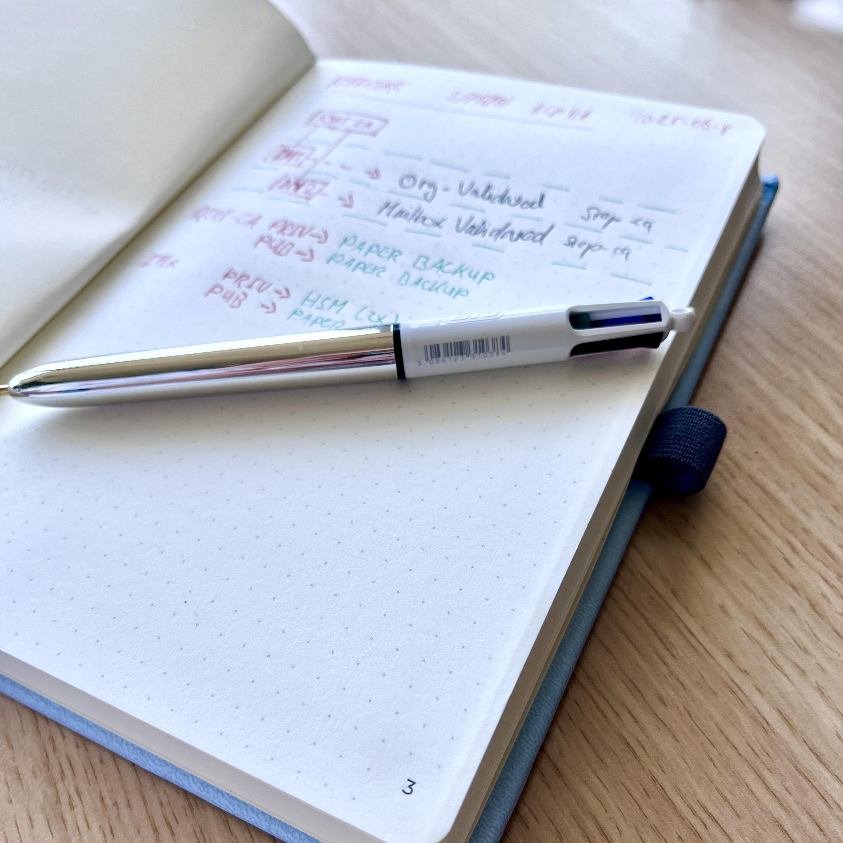 A page in my Zettelweise notebook with notes in different colours and the shiny BIC 4 colour pen on top