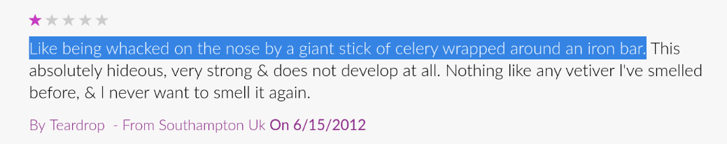 One-star review: Like being whacked on the nose by a giant stick of celery wrapped around an iron bar. This is absolutely hideous, very strong & does not develop at all. Nothing like any vetiver I've smelled before, & | never want to smell it again. By Teardrop - From Southampton Uk On 6/15/2012