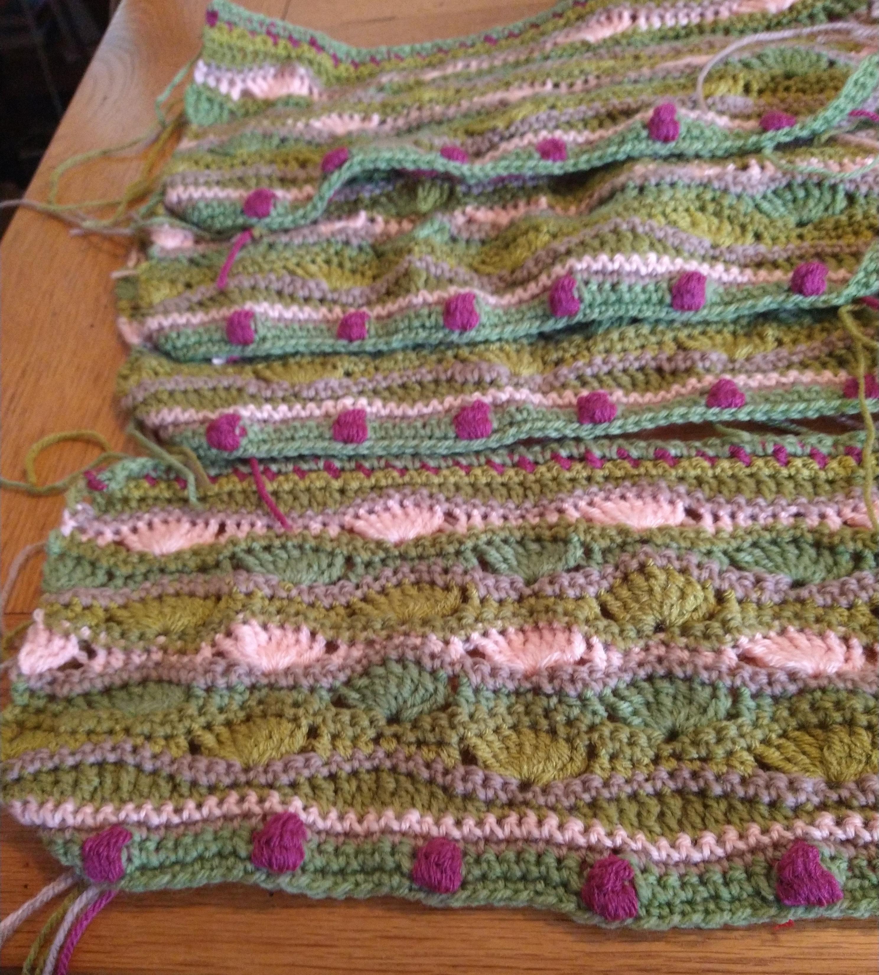Rectangular crochet blocks in greens and pinks with a wavy pattern and bobbles