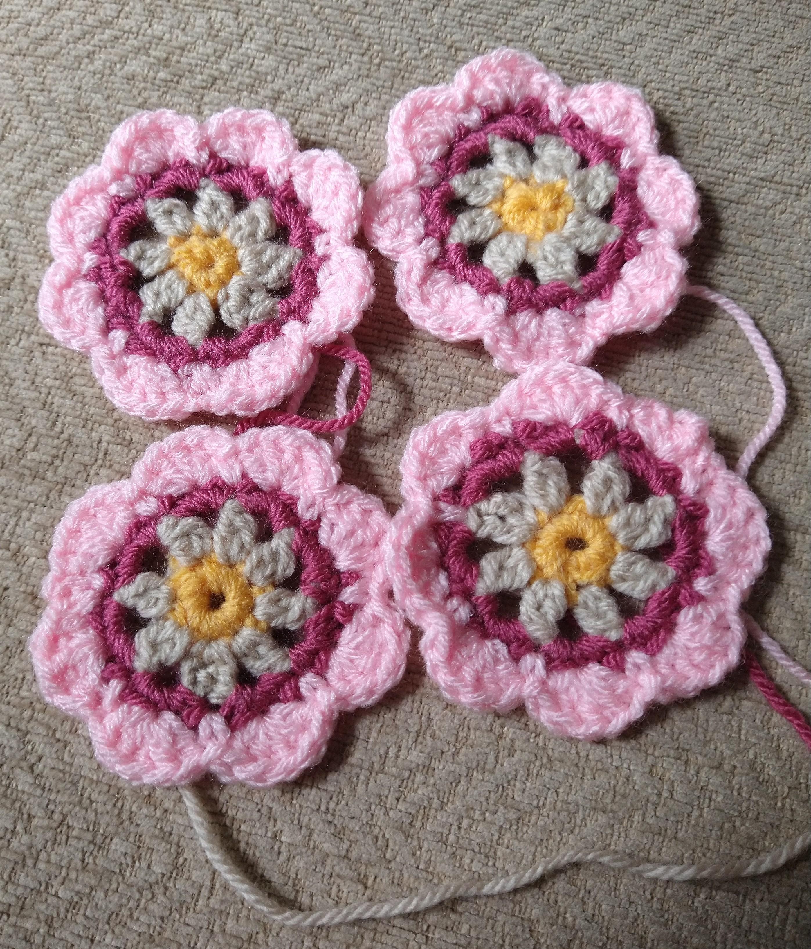 Crochet pink flowers with yellow centres
