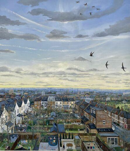 Painting looking slightly down on a UK townscape with terraced houses and gardens under a sky in which swifts-small birds, swoop