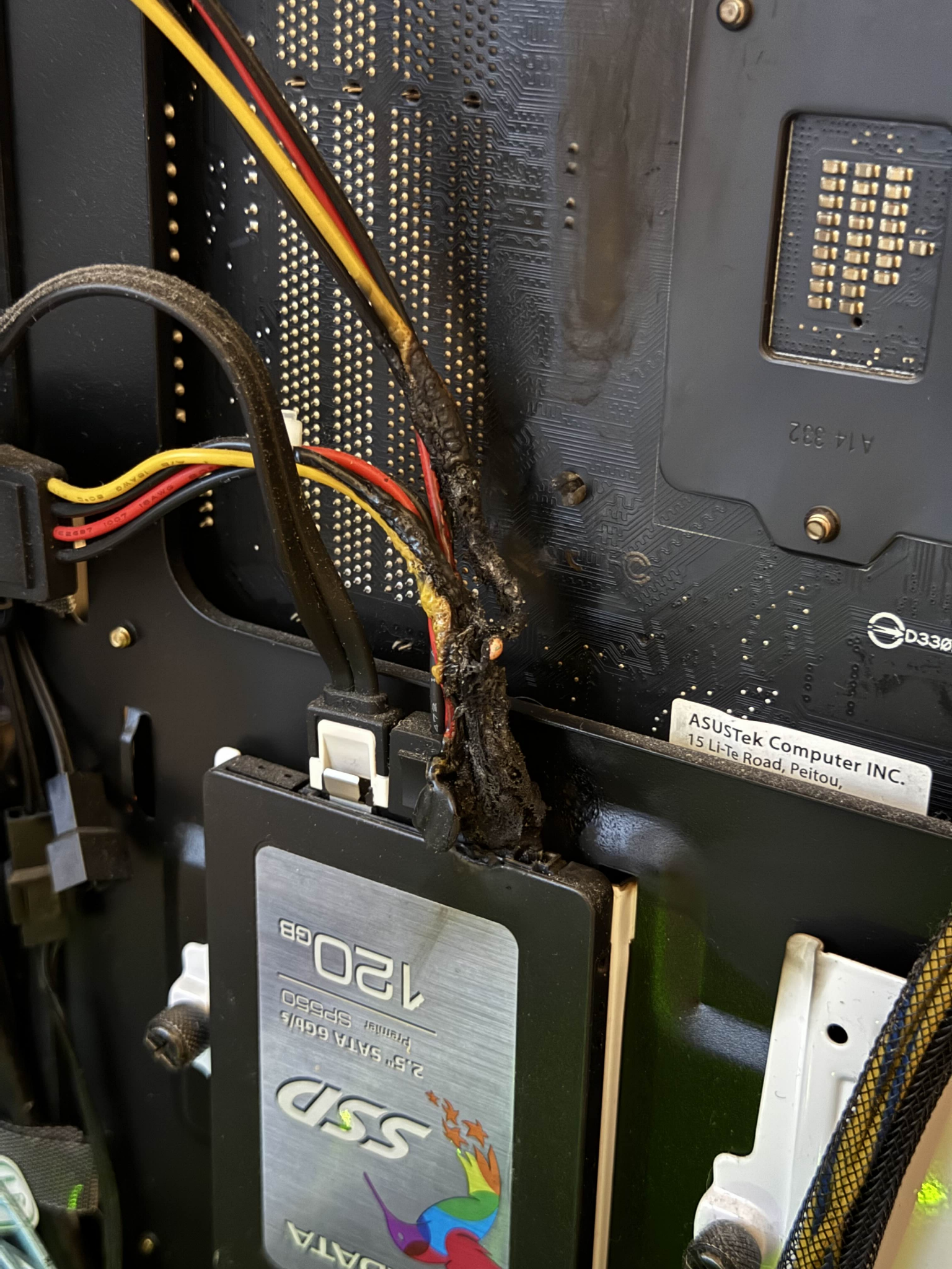 a photograph of a 2.5 inch SSD mounted on the backside of a motherboard, the sata power cable sticking out of it is half melted and there's a streak of soot going up t0oward the top of the case