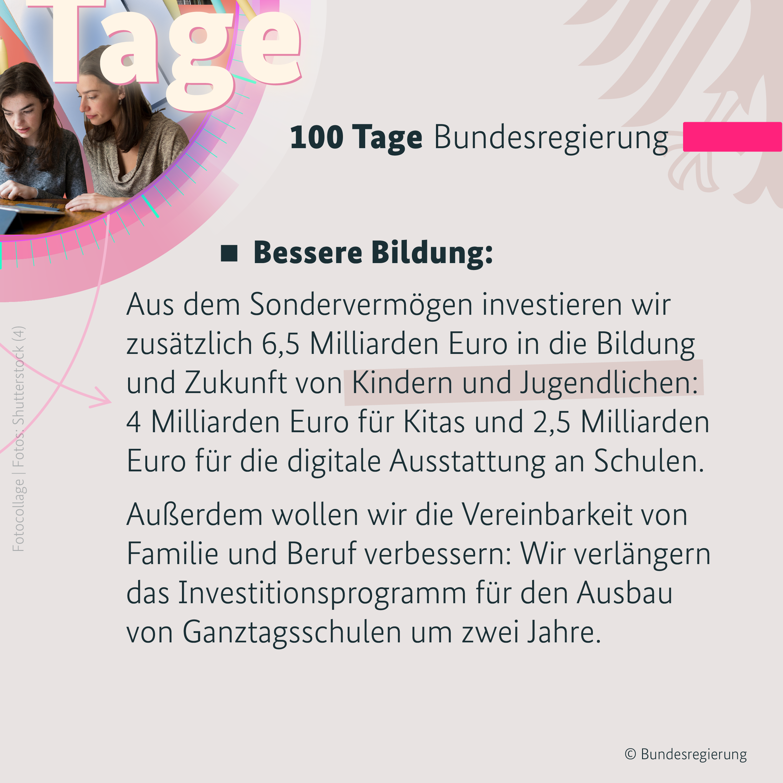 Im Text wird angekündig, dass zusätzliche 6,5 Milliarden Euro aus dem Sondervermögen für Bildung und Zukunft von Kindern und Jugendlichen fließen – darunter 4 Milliarden Euro für Kitas und 2,5 Milliarden Euro für digitale Ausstattung an Schulen. Außerdem: Verlängerung des Investitionsprogramms für Ganztagsschulen um zwei Jahre. Links im Bild: Zwei Schülerinnen arbeiten gemeinsam am Tablet.