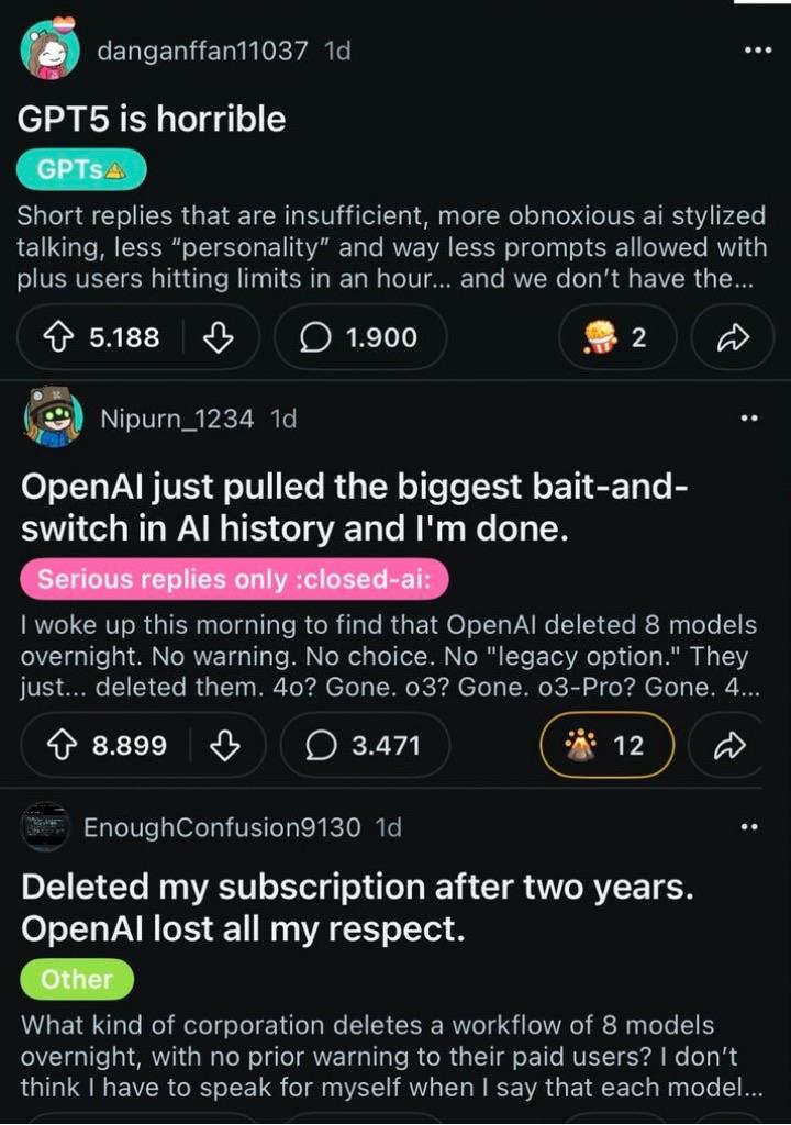 A series of user comments expressing dissatisfaction with GPT-5 and OpenAI's recent decision to delete several models without prior warning. Users share frustrations about the changes and the lack of communication from OpenAI. The comments reflect a sense of betrayal and disappointment.