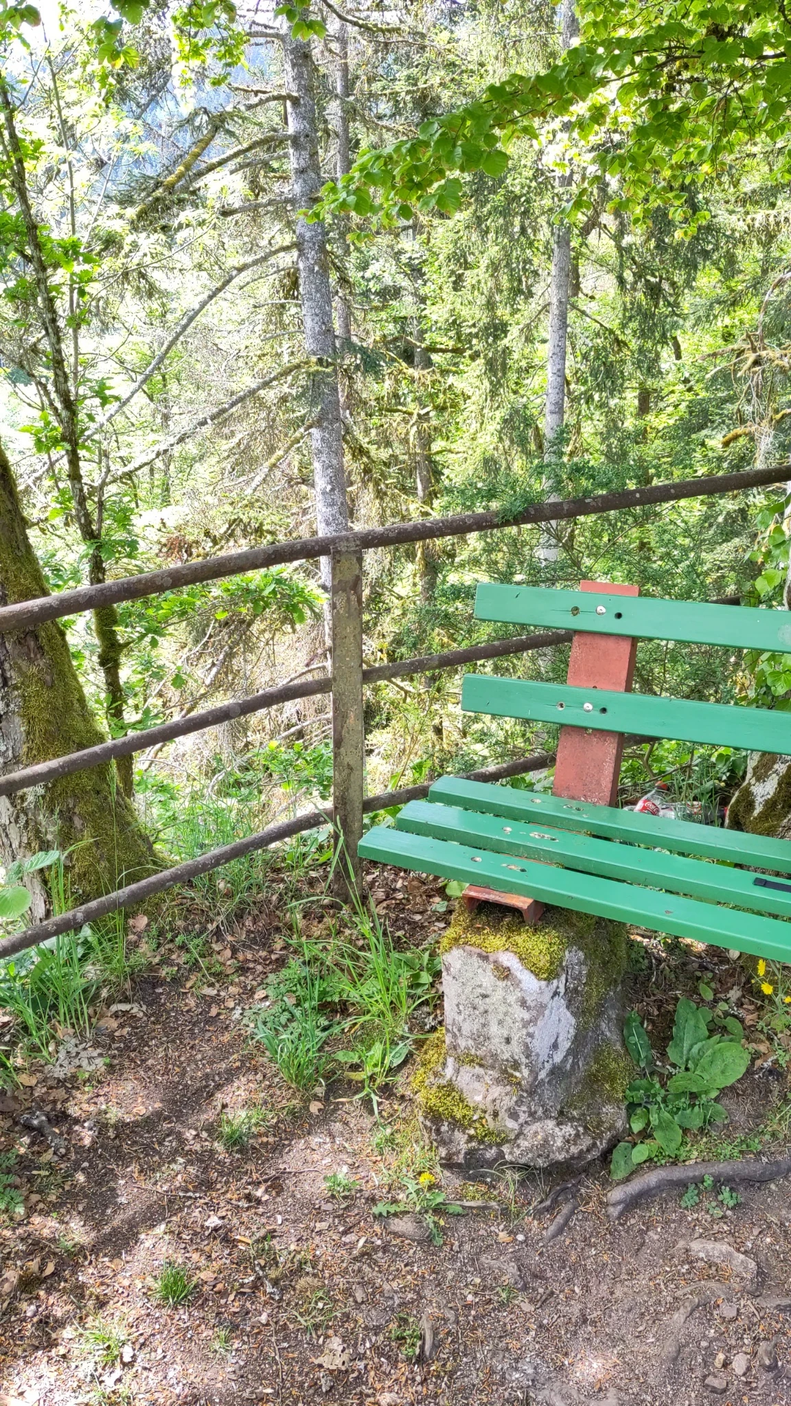 Leere Kunststoff-Getrรคnkeflaschen liegen hinter der Sitzbank auf der Burgruine Unter-Falkenstein
