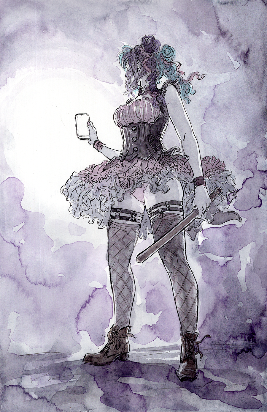 A watercolour mood painting of Eike, the main character for Jenitales Artemisia. She's in full investigator mode, using her phone as a flashlight and holding a baton in the other hand. She's in lolita inspired clothing and standing in a way that gives us a cheeky upskirt shot
