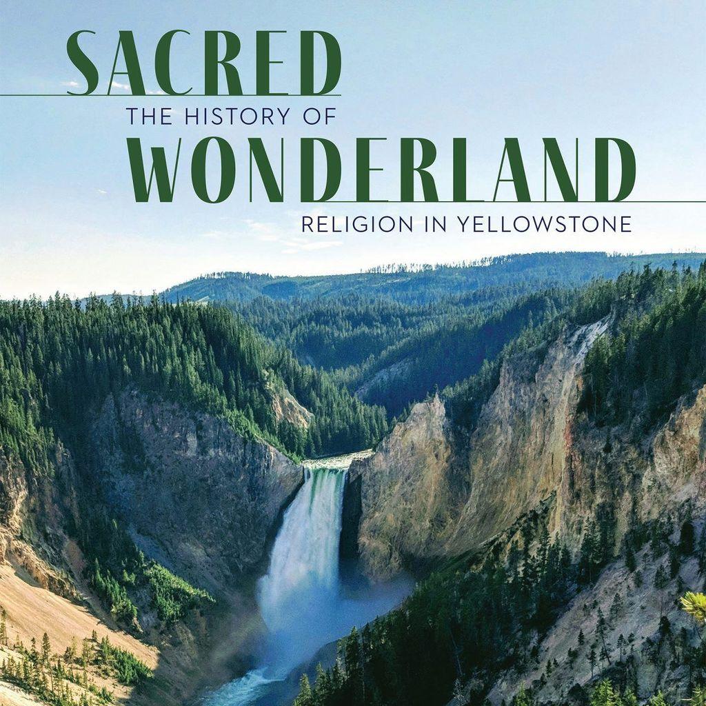 Book cover with an image of a waterfall in a large canyon. Title reads Sacred Wonderland the history of religion in Yellowstone Thomas S. Bremer.