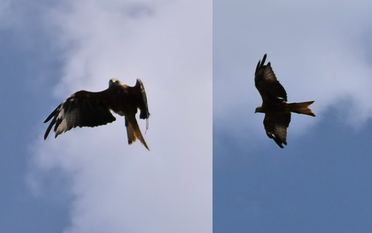 A collage of two pictures of a red kite (bird of prey) against a blue sky with some clouds
