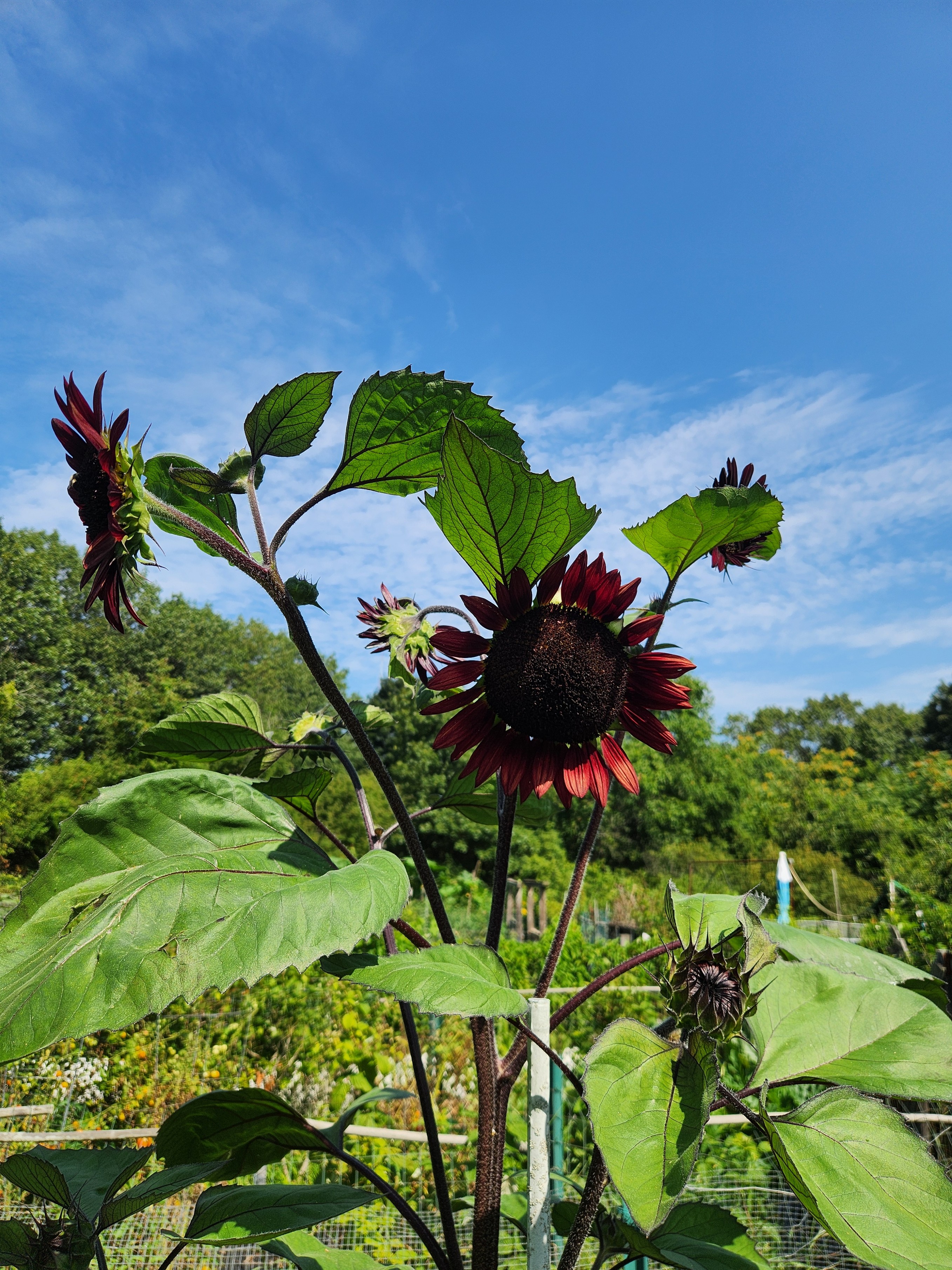 A tall velvet queen sunflower against a background of forest and blue sky. The sunflower has one large purple flower open towards us with several others dlfacing in different directions. The leaves look extraordinarily large in this view.