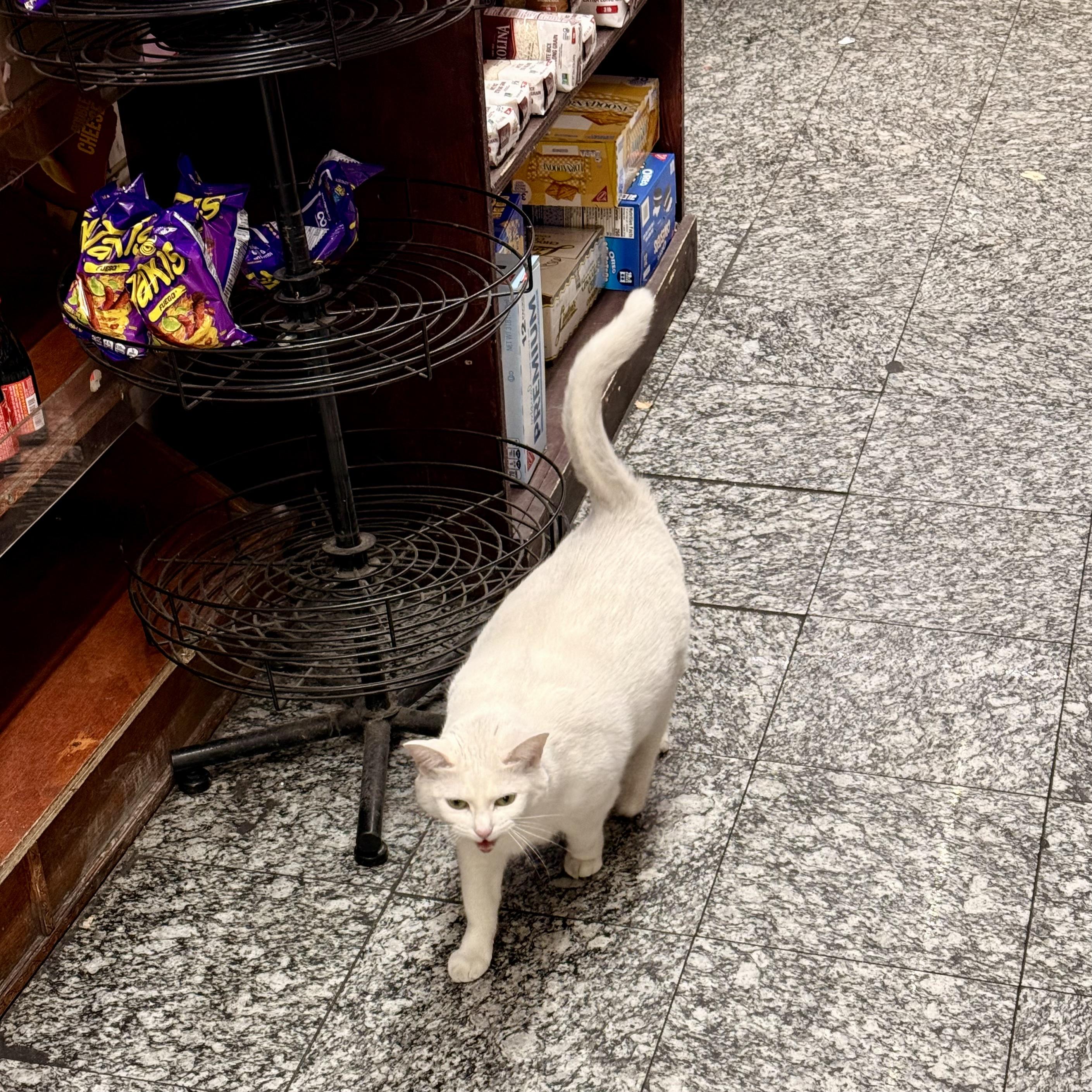 A color photograph in square aspect ratio. Taken inside of a bodega on the lower east side of Manhattan. A white haired cat is facing towards the camera and hissing standing in front of a product display with bags of Takis brand chips sitting on on it. Behind the cat is another shelf with snacks cakes on it. The floor is a grey colored linoleum tile.
