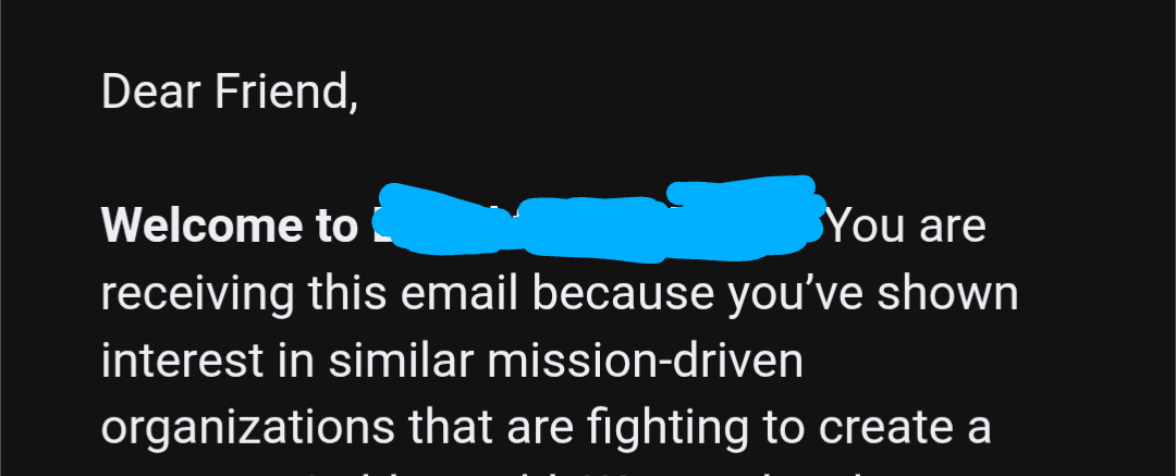 Screenshot of an email excerpt: Dear Friend, Welcome to [redacted]. You are receiving this email because you've shown interest in similar mission-driven organizations that are fighting to create a