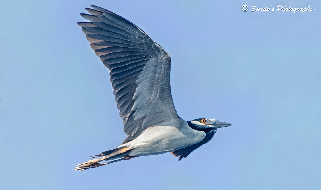 "A yellow-crowned night heron glides through a cloudless blue sky, its wings outstretched in a perfect arc of motion. The bird’s flight is steady and deliberate, as if it’s tracing invisible paths across the morning air. Its head is striking and regal, framed by bold black and white markings that give it a masked, almost ceremonial appearance. A crisp white cheek stripe contrasts sharply with the dark crown and face, emphasizing the bird’s intense gaze. The eyes are large and golden-orange, glowing like twin embers—alert, focused, and quietly commanding. Its beak is stout and slightly curved, slate-gray in color, built for grasping crustaceans and small prey. It juts forward with quiet confidence, completing the bird’s focused, predatory profile. The body is compact and muscular, cloaked in smooth, slate-gray plumage that shimmers subtly in the light. Each feather seems to lie in perfect alignment, giving the bird a polished, aerodynamic look. The wings, broad and powerful, stretch outward with layered feathers that ripple like silk in motion. Their undersides are lighter, almost silvery, catching the sun as the bird banks and turns. The upper wings are darker, with faint barring that adds texture and depth to the otherwise smooth surface. Trailing behind are the legs, long and slender, extended straight like twin rudders. They’re a muted yellowish-orange, with a slightly rough texture, hinting at their strength and utility. The feet dangle behind." - Copilot with edits