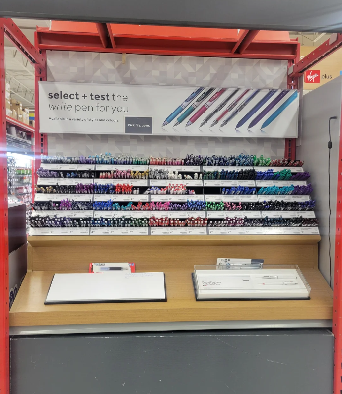 image of a kiosk in a stationary store to test different kinds of pens on paper.