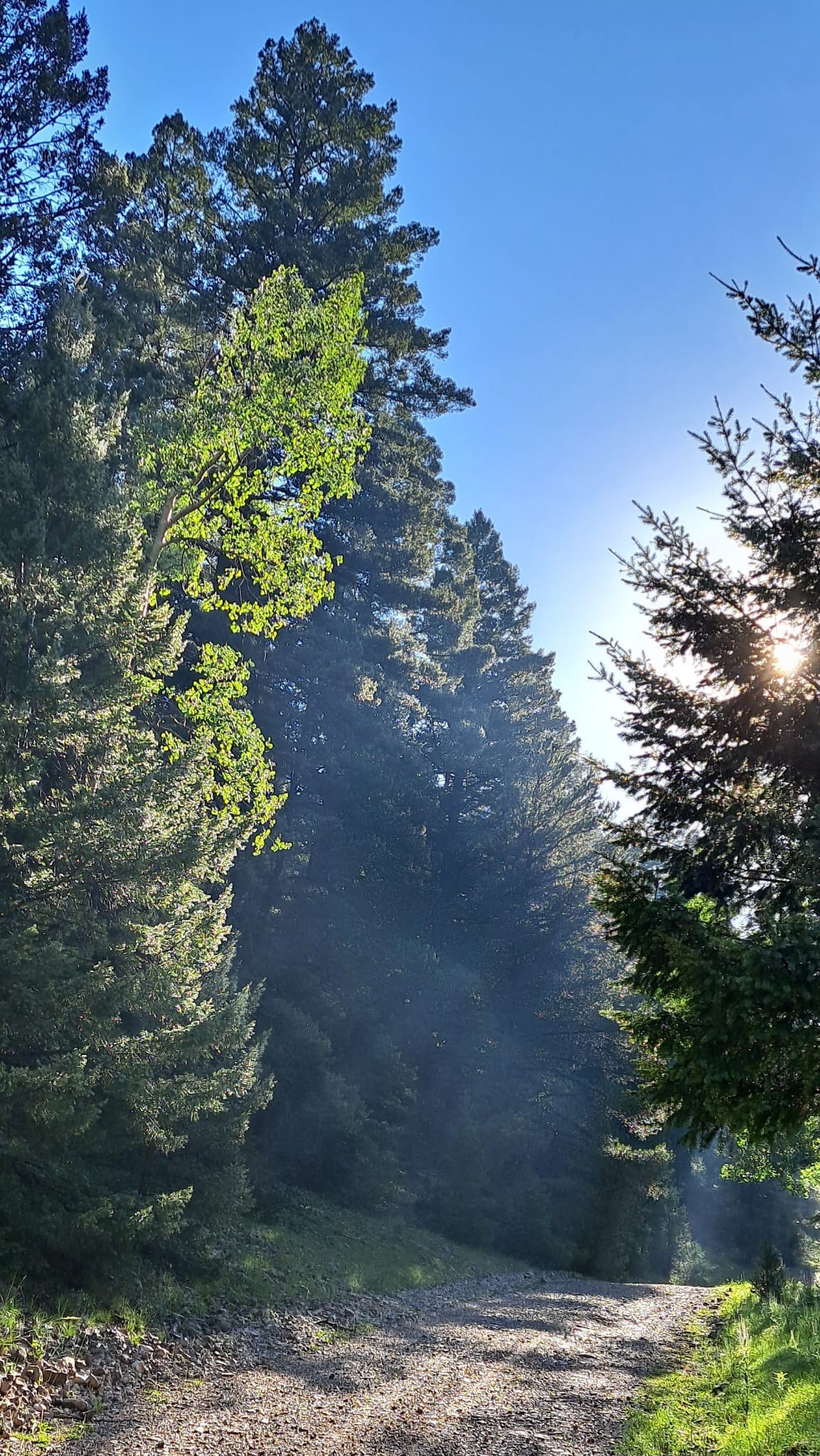 Light mist is backlit on a mountain gravel road. The aspen tree's leaves are a bright green.