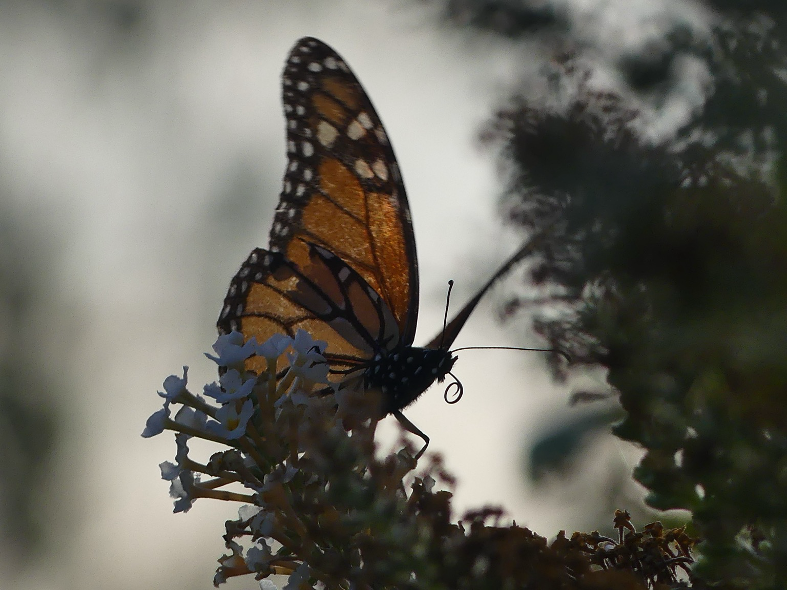 A monarch pauses for a nightcap on the butterfly bush, weak sunlight illuminating itβs wings, proboscis curled up charmingly