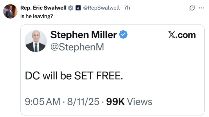 A screenshot of two X posts. The first post, by Rep. Eric Swalwell (@RepSwalwell ), asks, "Is he leaving?" with a timestamp of 7 hours ago. The second post, by Stephen Miller (@StephenM ), states, "DC will be SET FREE," with a timestamp of 9:05 AM on 8/11/25 and 99K views. Both posts include profile pictures and verification badges.
