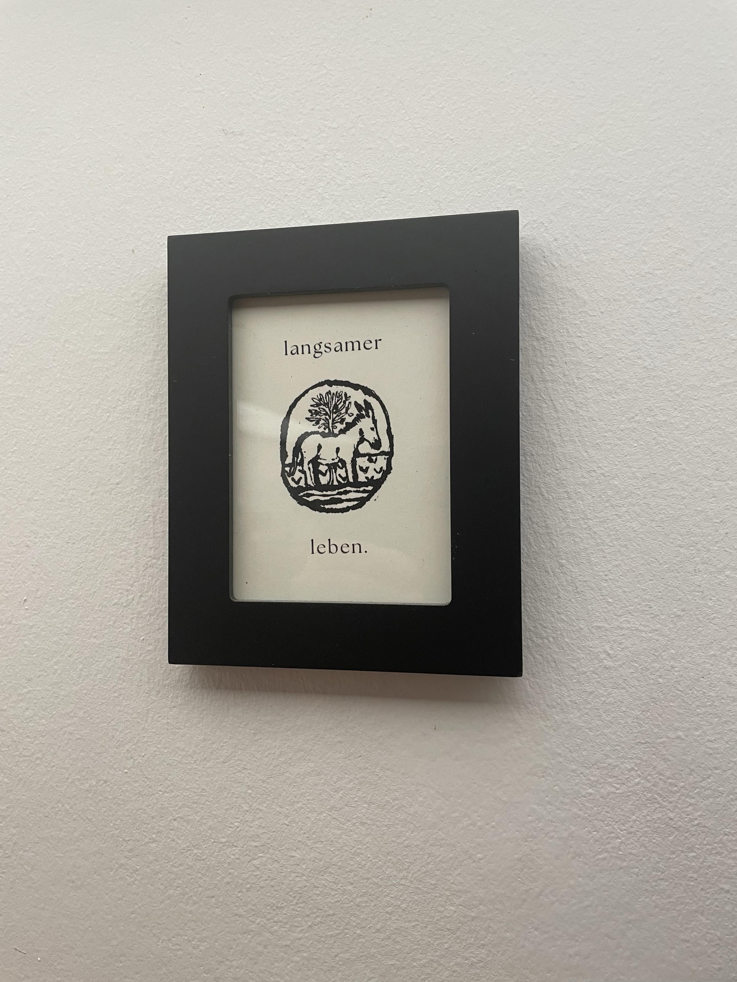 A framed artwork featuring the German phrase "langsamer leben" (meaning "live slower") above an illustration of a donkey with a tree design. The frame is black and the image is hung on a light-colored wall.