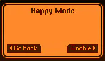 Flipper Zero display, prompting for confirmation. there should be a longer description of the thing being asked about, but the description is just blank. Happy Mode [Go back] [Enable]