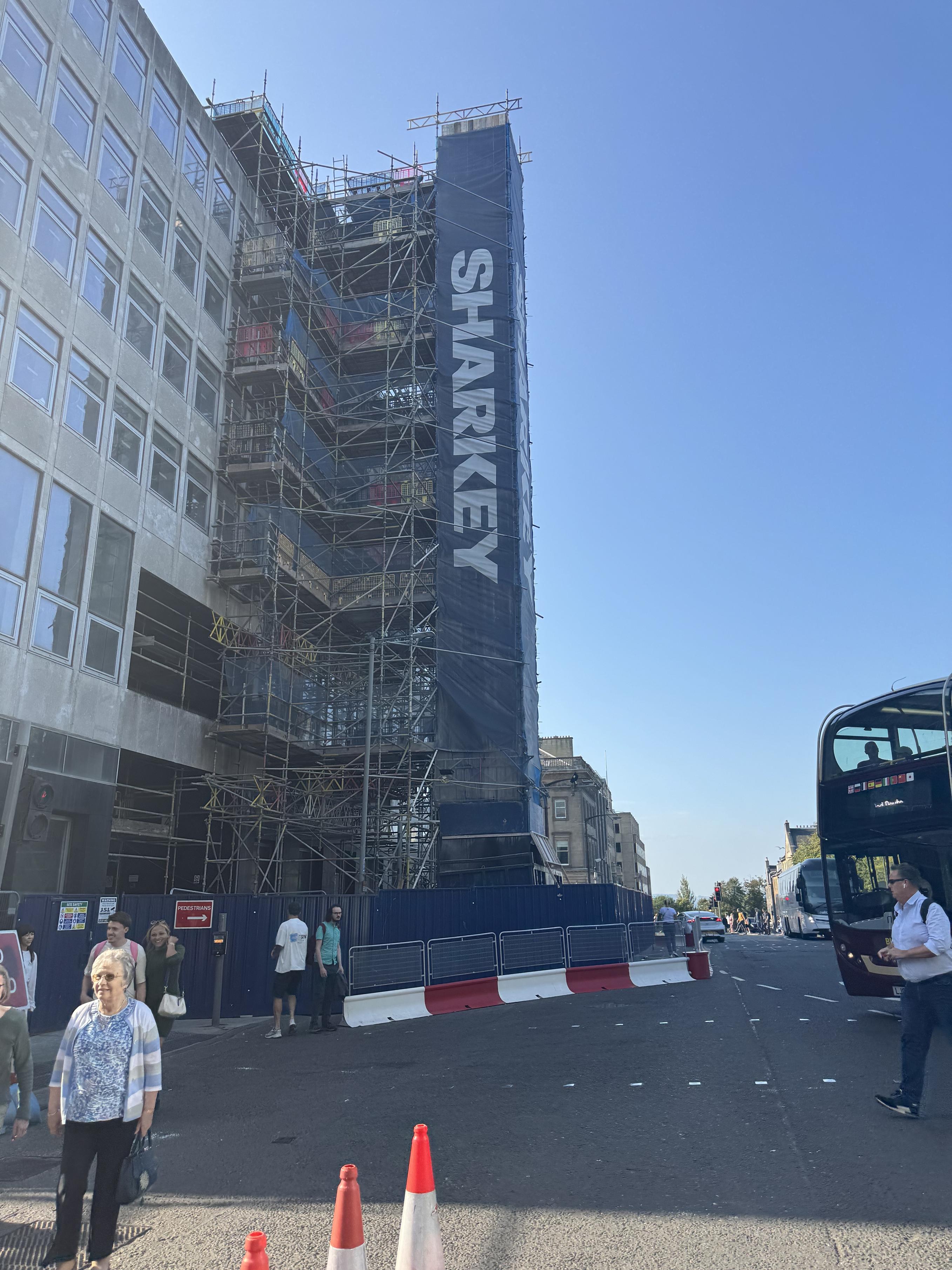 A building with scaffolding. The work Sharkey is printed on the scaffolding covers