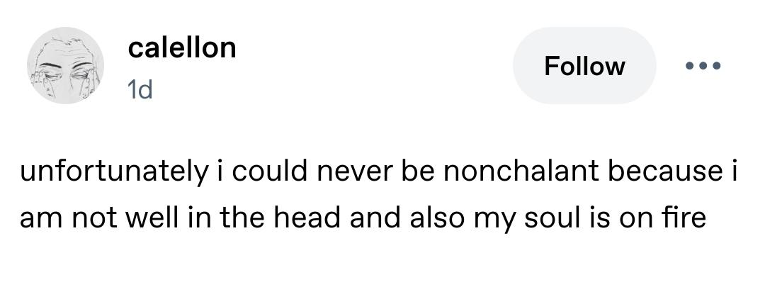 Tumblr post from user calellon unfortunately i could never be nonchalant because i am not well in the head and also my soul is on fire