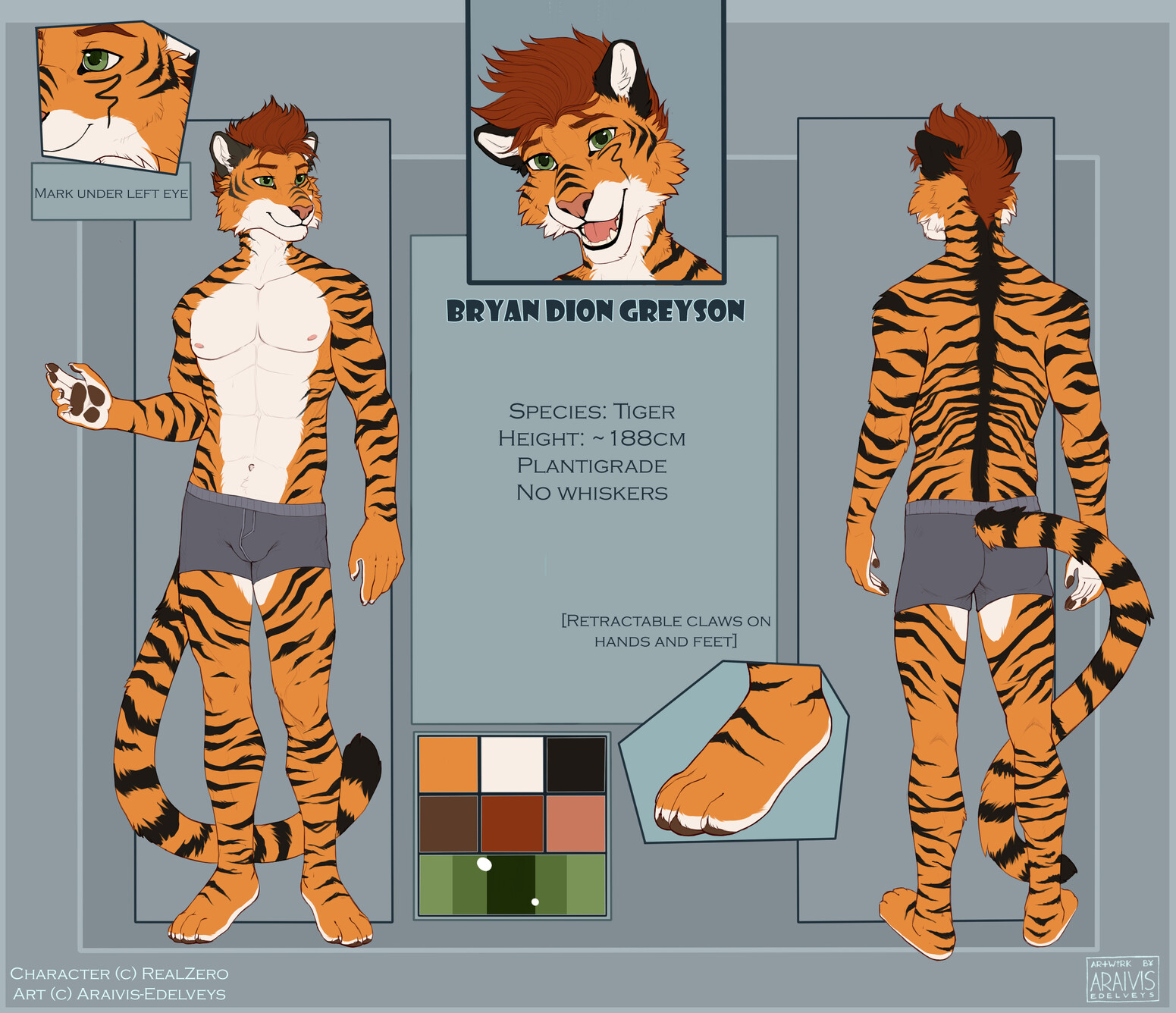 โReference sheetโ of Bryan, a male, anthropomorphic, bipedal tiger, showing a front- and back-view and some close-ups of his face and feet.. His fur is coloured like a regular tiger: mostly orange with black stripes and white fur on the lower part of his face, going down his front, neck, chest and belly, down to his upper thighs. He has green eyes and short, orange-brown hair styled upwards. He has a long, orange tail with black stripes and a black tail-tip. The insides of his hands as well as the underside of his feet is white with dark-brown โpawpadsโ similar to real cats. Und his left eye he has a black fur marking in the shape of a swirly line going downwards. He has no whiskers, but retractable claws on hands and feet. In this reference sheet he's only wearing dark-grey boxer-briefs, his chest and stomach muscles are visible very slightly.