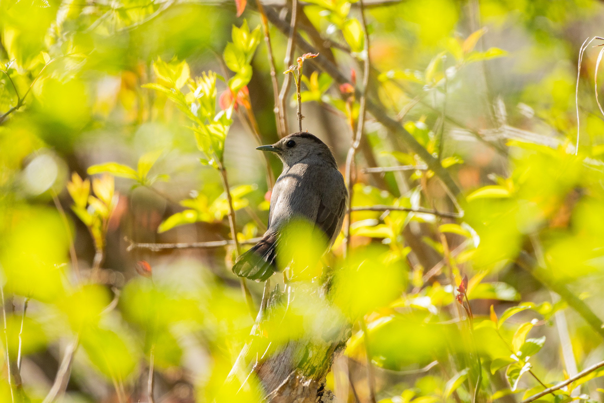 A gray catbird with smooth gray-brown feathers is perched on a branch surrounded by bright green and yellow leaves, with sunlight filtering through the foliage. description by csilverman@mastodon.social