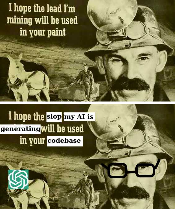 Two images: Top image has an old timey miner in the front with text that says: "I hope the lead I'm mining will be used in your paint" with a donkey and a man in the background. Bottom image has same old timey miner but with eyeglasses. The text has been badly changed to "I hope the slop my AI is generating will be used in your codebase" with a donkey which head has been changed to ChatGPT in the background.