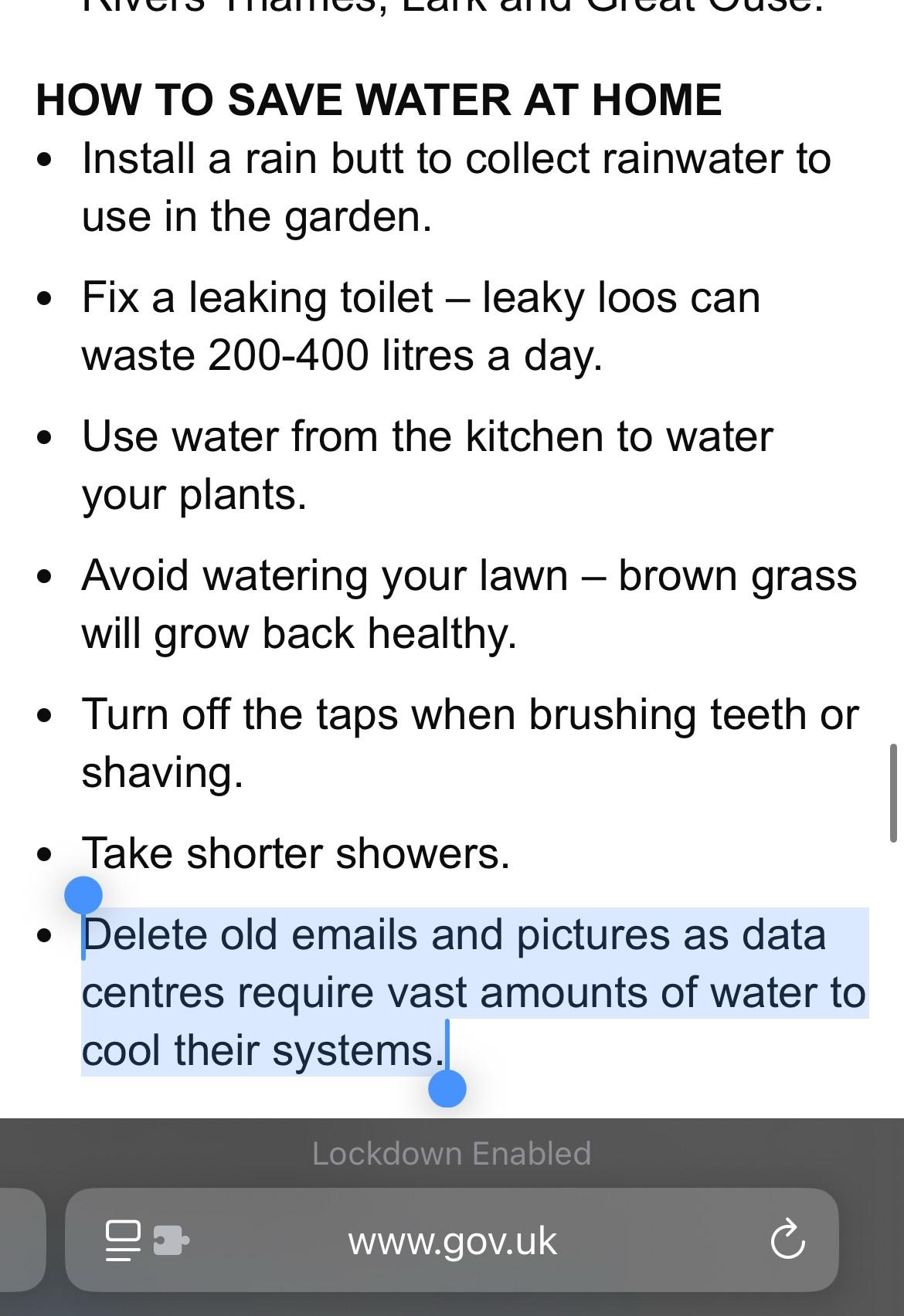 HOW TO SAVE WATER AT HOME Install a rain butt to collect rainwater to use in the garden. Fix a leaking toilet – leaky loos can waste 200-400 litres a day. Use water from the kitchen to water your plants. Avoid watering your lawn – brown grass will grow back healthy. Turn off the taps when brushing teeth or shaving. Take shorter showers. Delete old emails and pictures as data centres require vast amounts of water to cool their systems.