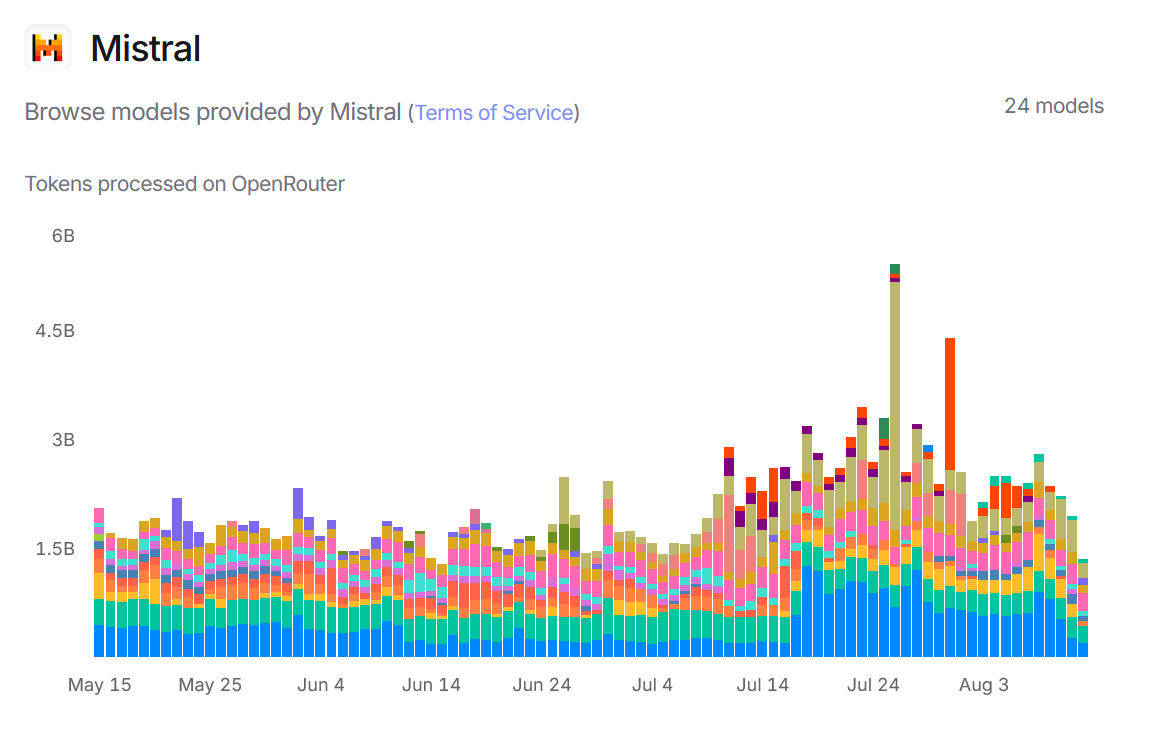 Mistral AI usage graph from OpenRouter with different colour representing different ai model. During the summer holiday months the usage does not drop.