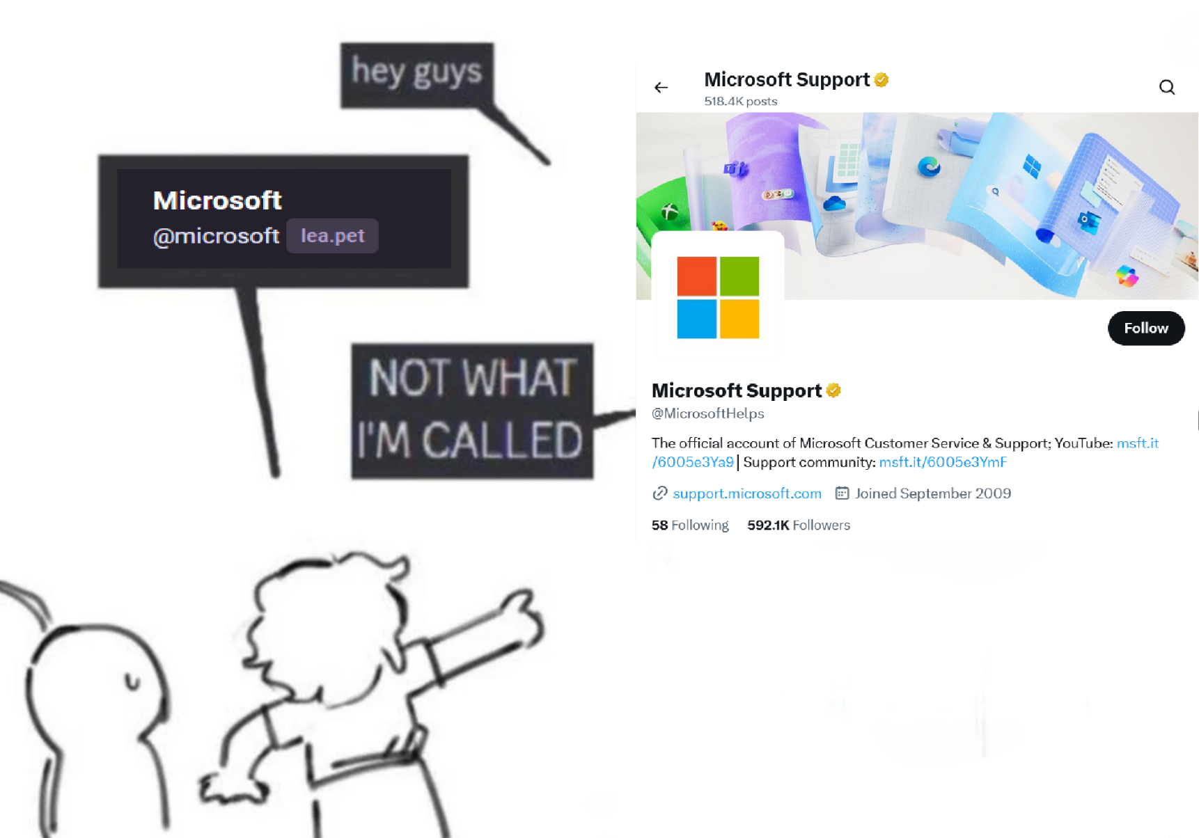 Microsoft Support account on Twitter: "hey guys" Two stick figures: "@microsoft@lea.pet" Microsoft Support: "NOT WHAT I'M CALLED"