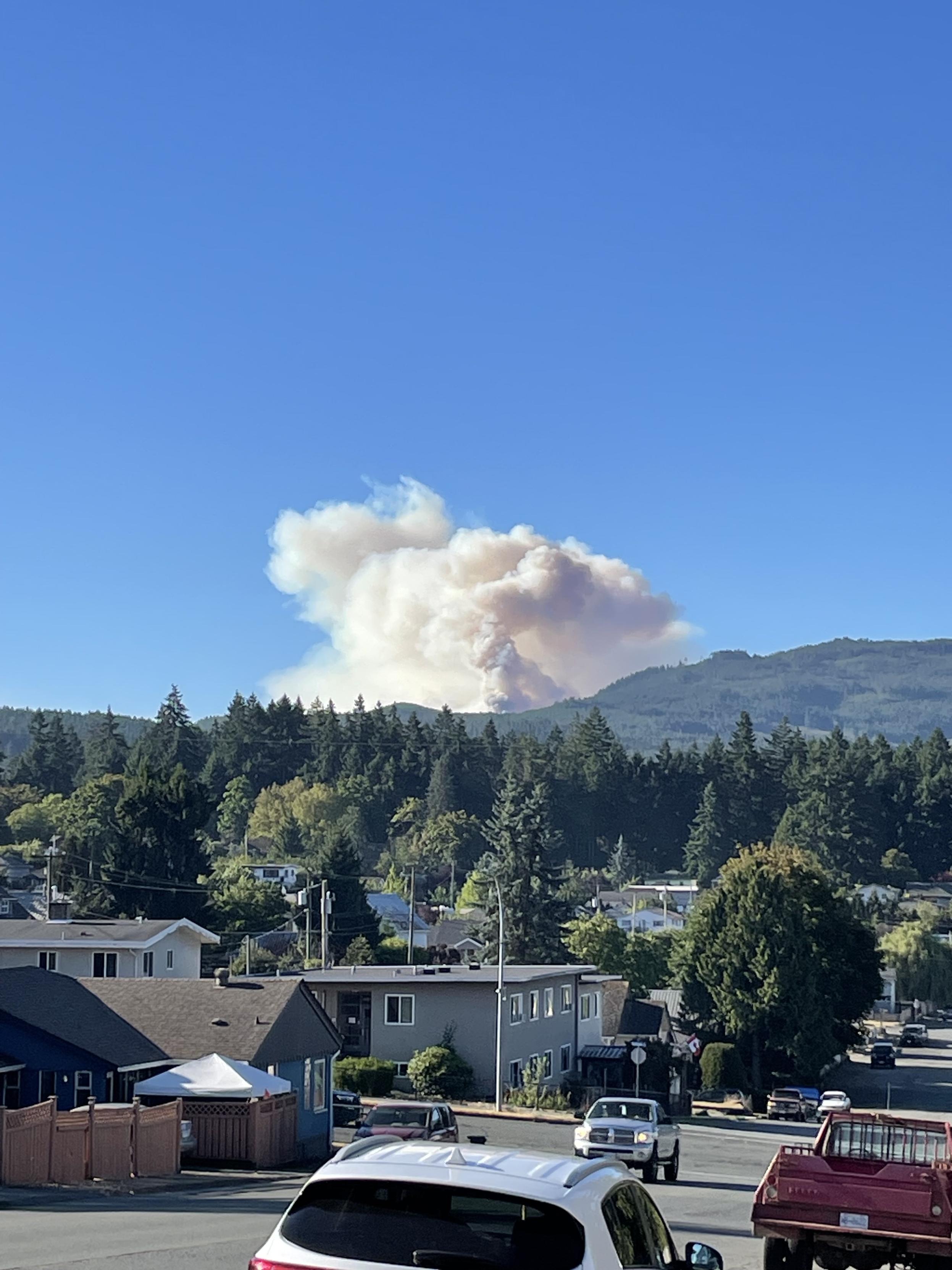 Smoke rises above the mountain in the distance